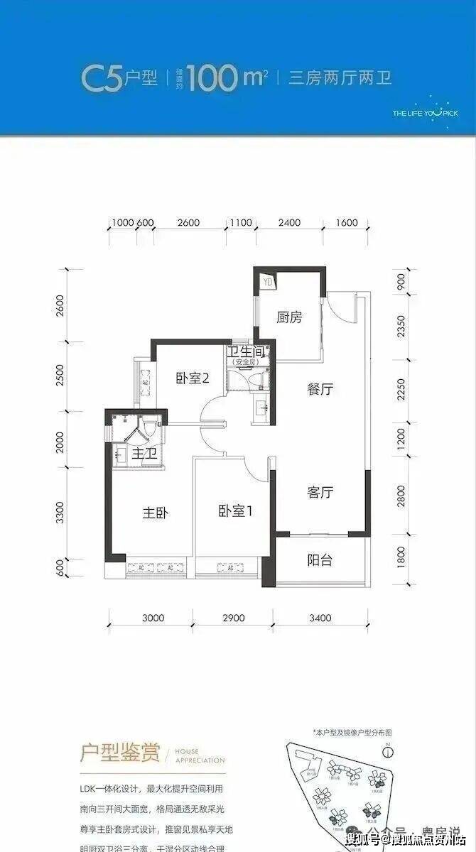 100平三房:设计的是竖厅格局,进门入户玄关,客厅3.4米开间,LDKB一体化设计,3个卧室分别做到了3米/2.9米/2.5米的宽度,U型厨房,公卫三段式分离,得房率:77.14%(不含赠送),阳台1.8米宽度,西南或东南朝向。