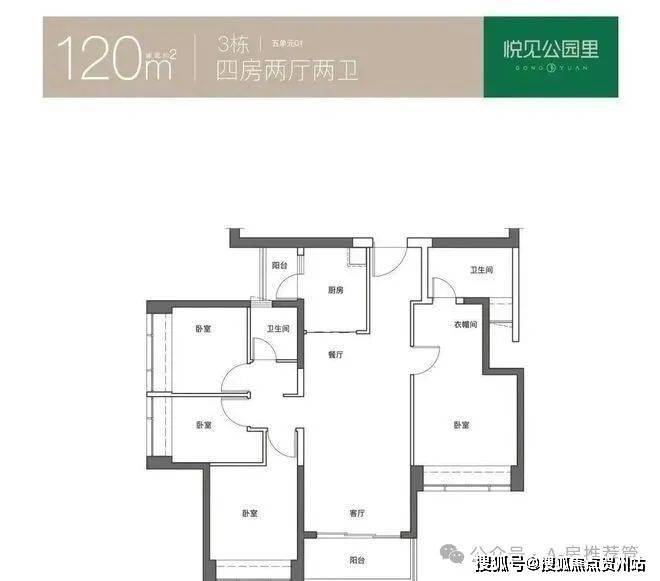 120㎡的4房2厅2卫,仅3栋5单元01户型,设计的是创新式双龙抱珠格局,L型厨房,公卫三段式分离,得房率74.13%(不含赠送),东南朝向。