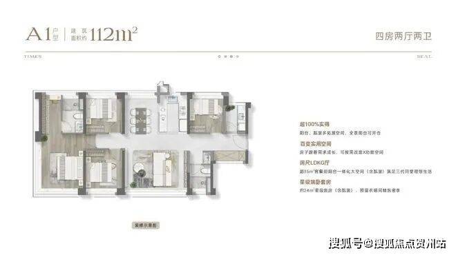 约110㎡四房两厅两卫:约16米通风面,户户是端户;约28㎡行政级端卧套房,270°景观视野,360°环统式采光;