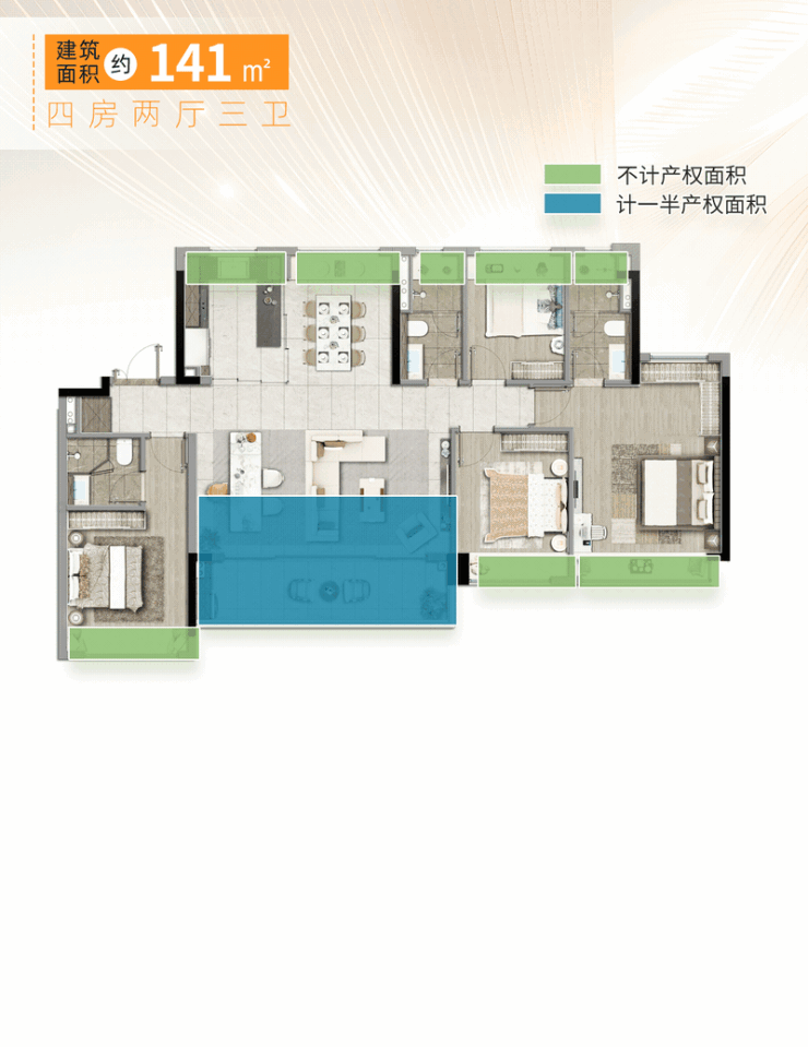 建面约141㎡的进阶首选户型,相比市场上同类型产品,同样的建面多出不计算面积的灵动空间,就好像开发商偷偷塞给你的私房钱