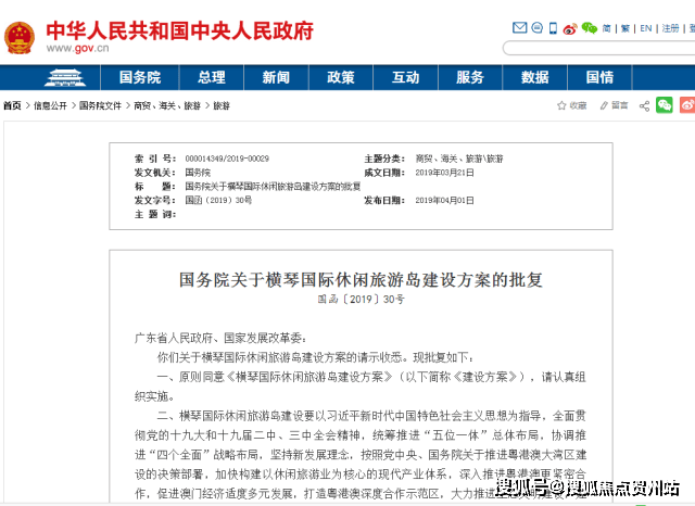 2019年初,国务院公布了关于《横琴国际休闲旅游岛建设方案》的批复,提出“打造粤港澳深度合作示范区,大力推进生态文明建设……逐步将横琴建设成为面向未来、国际品质、生态优先、协同发展、智慧支撑的国际休闲旅游岛”的基本方向。