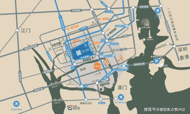 · 交通:近港珠澳大桥、深中通道,15-20 分钟达拱北口岸,门口有公交与港澳直通车,5 公里内至华发商都,2 公里至坦洲优越城。