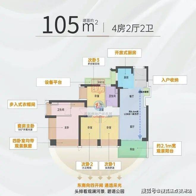 本批次产品中最大面积户型,位于1栋,东南朝向最前排,一共两条腿。观景阳台约2.1米宽,加上三个卧室一共四开间推窗即是观澜河、碧道公园、大布巷历史文化公园景观,视野开阔无遮挡,居住感受好。