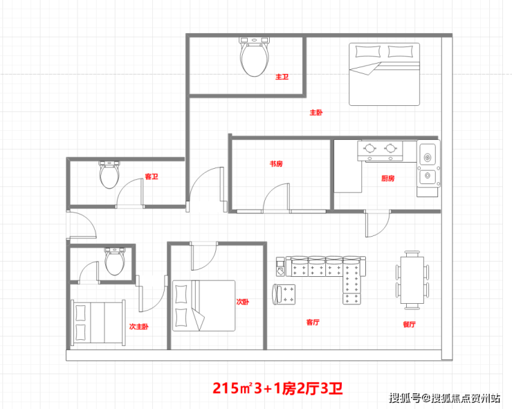 主力户型为157-228㎡的三至四房,采用6T6户布局,涵盖多种空间组合方式。