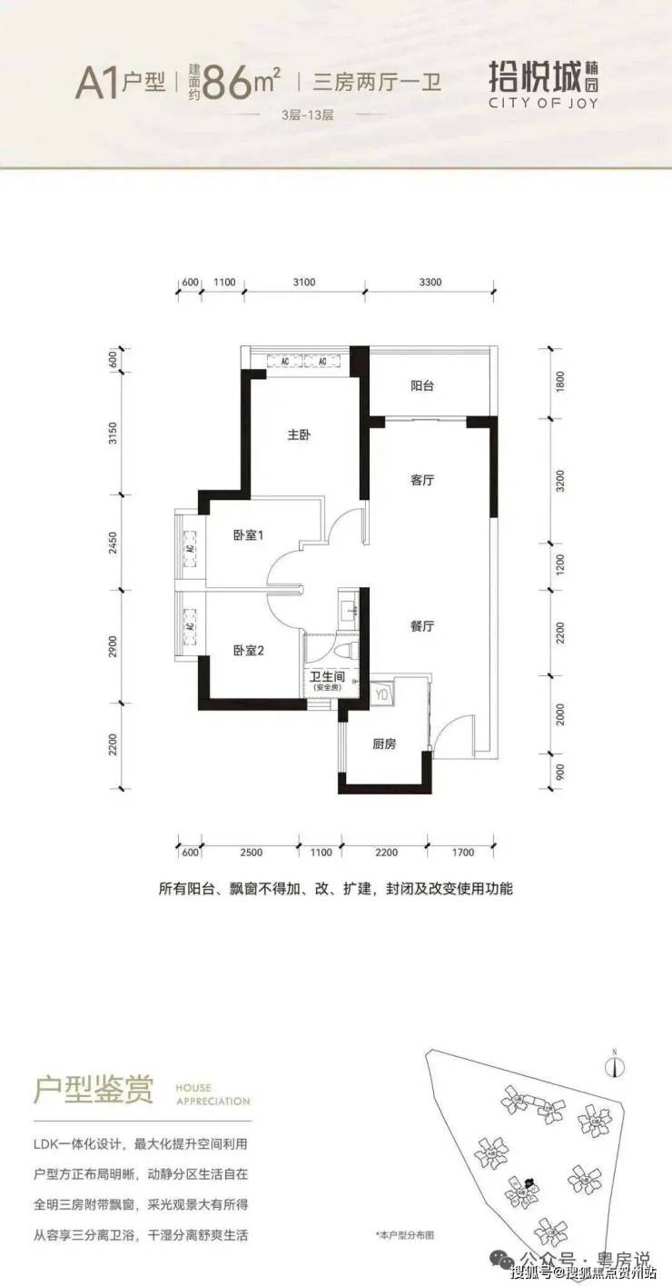 86平三房:设计的是竖厅格局,进门入户玄关,客厅3.3米开间,LDKB一体化设计,3个卧室分别做到了3.1米/2.9米/2.45米的宽度,U型厨房,卫生间三段式分离,得房率:76.92%(不含赠送),阳台1.8米宽度,东北朝向。