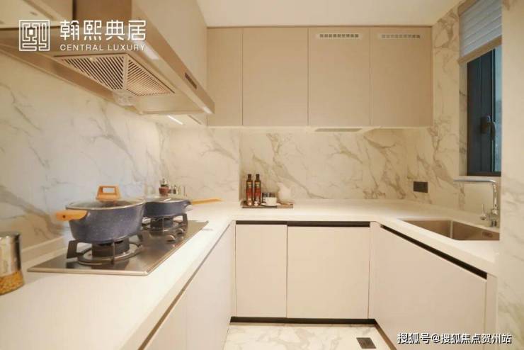 U型厨房动线规划科学,吊轨推拉门释放地面空间,墙面地面采用大板通铺的岩板,搭配一线豪宅常用的国际品牌厨电四件套(燃气灶+抽油烟机+洗碗机+冰箱),将实用与美学完美统一。