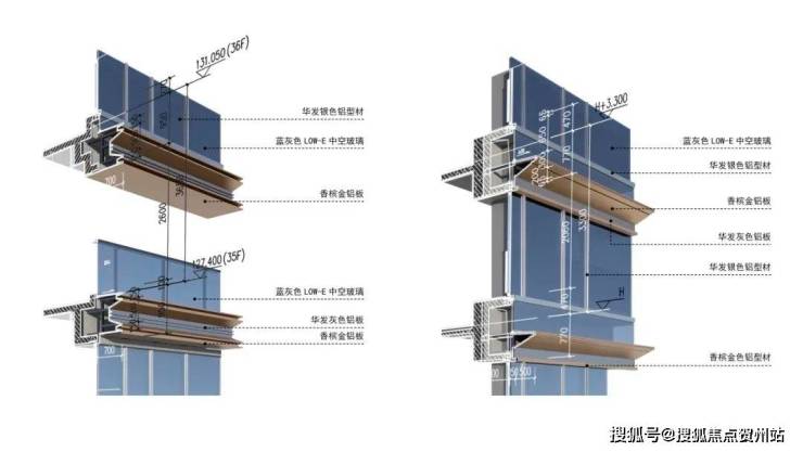 避难层融入“新加坡空中花园意向”,材料色彩上融入纽约中央公园豪宅意向,通过香槟金色铝板、蓝灰色类玻璃幕墙营造高级豪宅气质,在本土地域性特质中增加国际性表达。