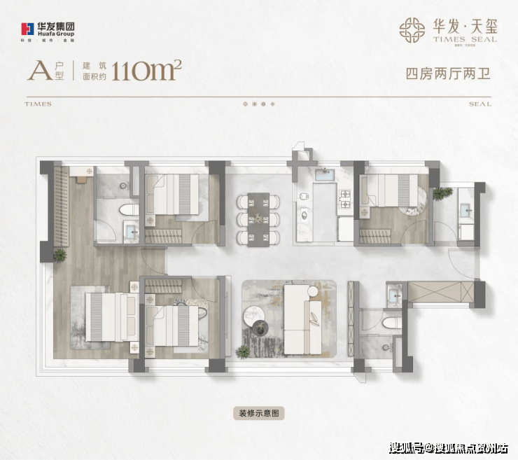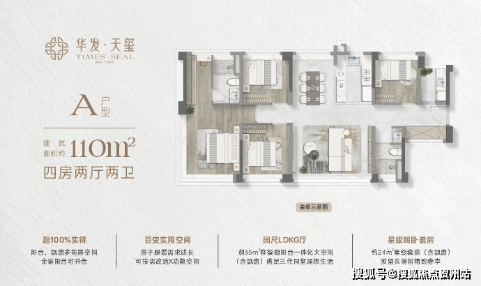 约110㎡四房两厅两卫:约16米通风面,户户是端户;约28㎡行政级端卧套房,270°景观视野,360°环统式采光