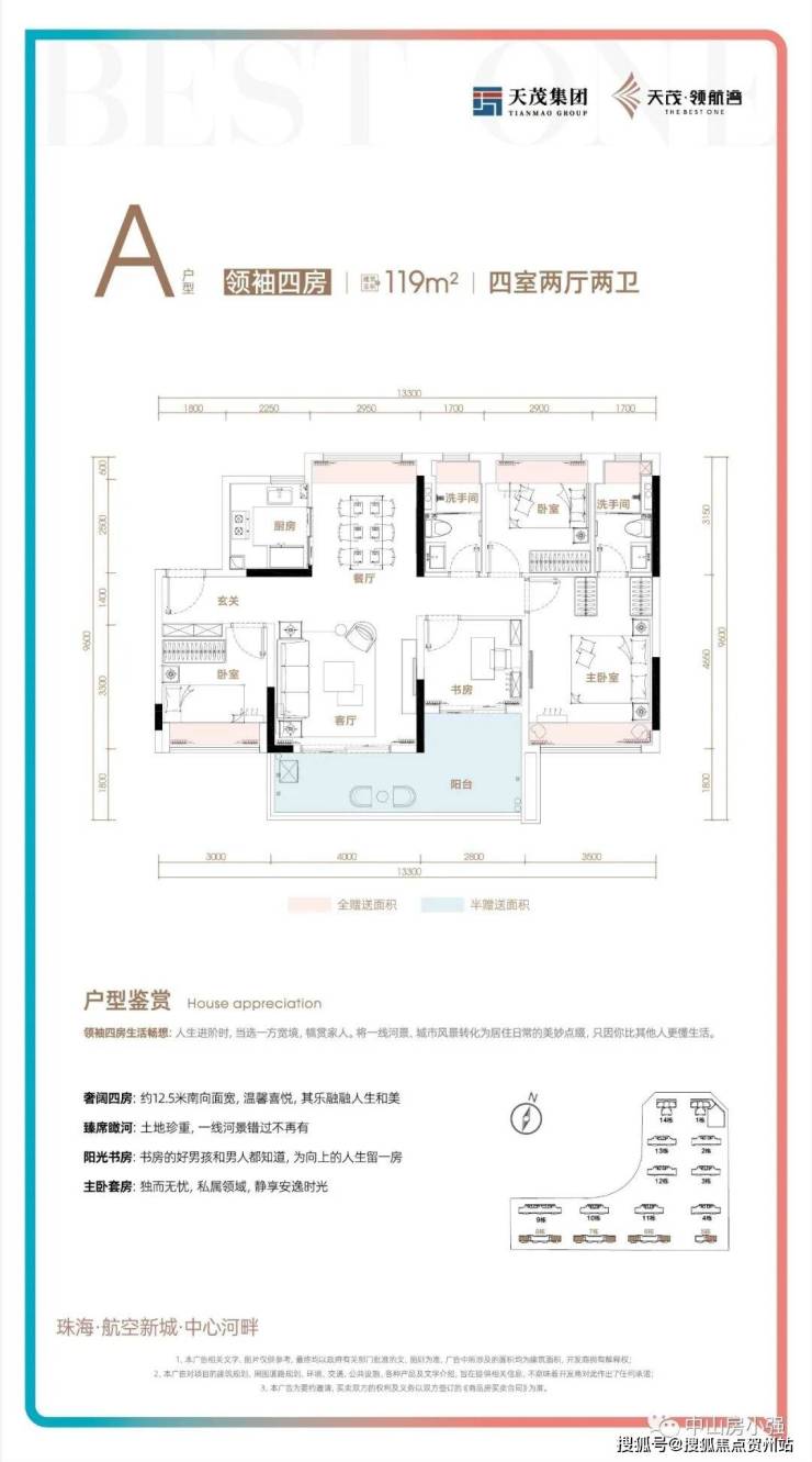 (2)119㎡四房两卫奢阔四房,约12.5米南向面宽,一线河景错过不再有;