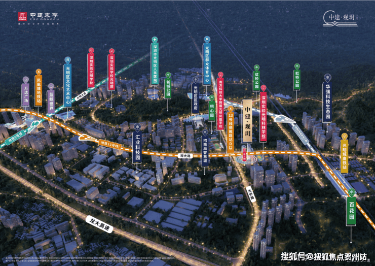 中建观玥坐落于光明区政府东南侧,光侨路与观光路交汇处,邻近地铁13号线德雅路站,除了有全区TOP级的市政配套,还有稀缺的生态资源。