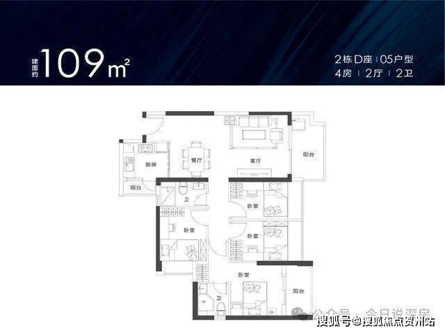 109㎡的4房2厅2卫,设计的竖厅格局,客厅主卧双阳台设计,厨房也带小阳台,四开间朝南,客厅朝东南向。