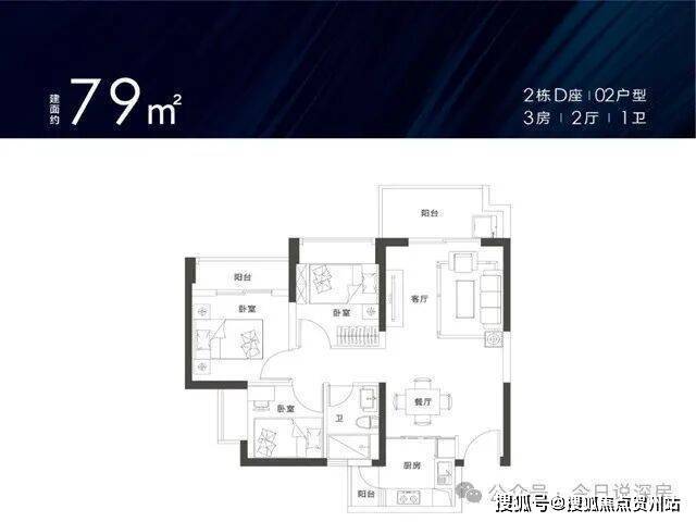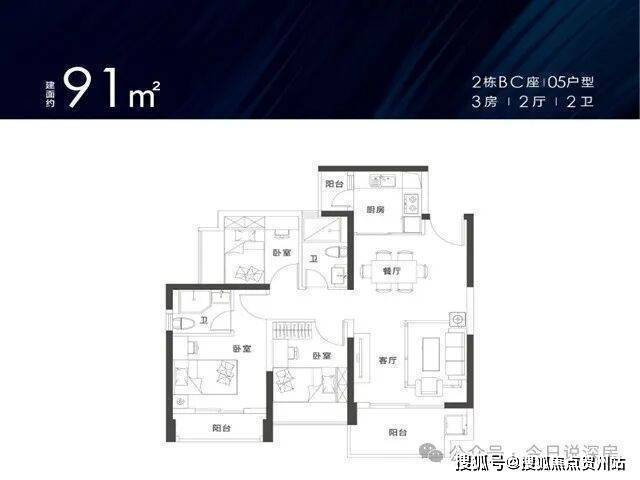 91㎡的3房2厅2卫,设计的经典竖厅格局,客厅主卧双阳台设计,厨房也带小阳台,三开间朝南,客厅朝西南向,有1个2栋D座03户型非常类似,客厅朝东北向