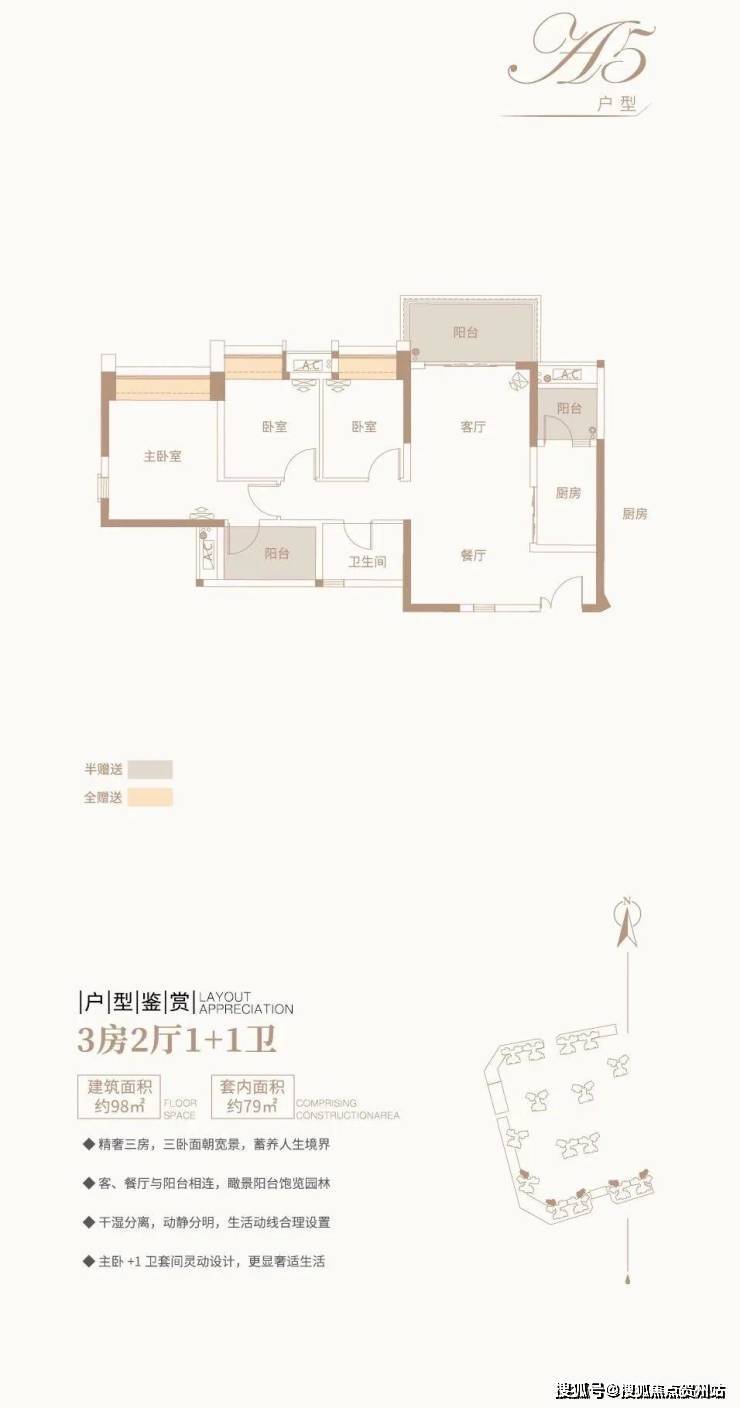 3房2厅1+1卫/约98平方米/精奢三房,面朝宽景