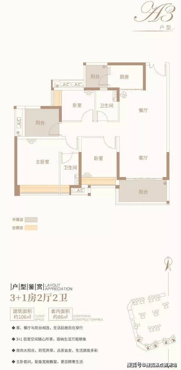 3+1房2厅2卫/约106平方米/南向阳台,宽敞客厅