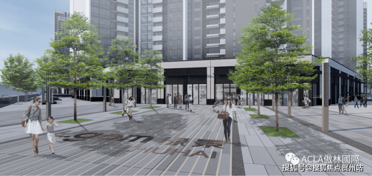 绿景 · 玺悦湾的配套商业主要集中在茂丰路西侧沿街裙房,延续现代、直线的设计语言打造本项目的商业街;利用特色种植池将本地的大榕树以及土地公区域保留下来,并在旁设有东桥村历史发展的拓印坐凳,为商业街留下专属的记忆点。