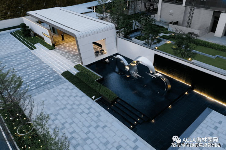 与泳池相连的跌水主水景,让访客用一望无际的视角来欣赏雕塑艺术品《乘风破浪》。