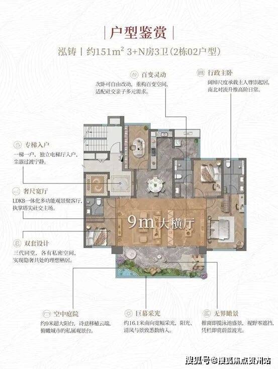 3栋151㎡3+N房户型,实用率高达117%,专梯专户设计,户户奢享专属电梯厅,仅62套。