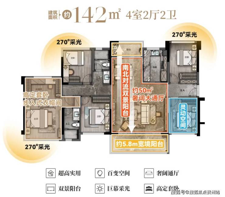 建面约142㎡改善大平层,超100%使用率,拥有4+1可变空间,创意空间可自由随心改造书房/卧室,可以是阔尺五房的满分改善,也可以是全能生活主场,领略终极改善可塑性。