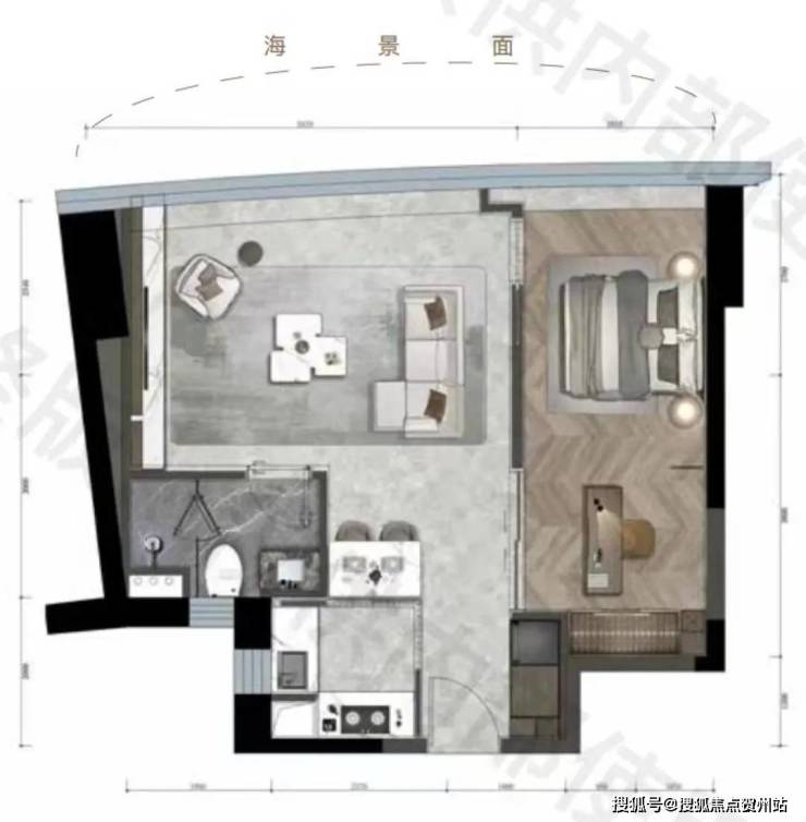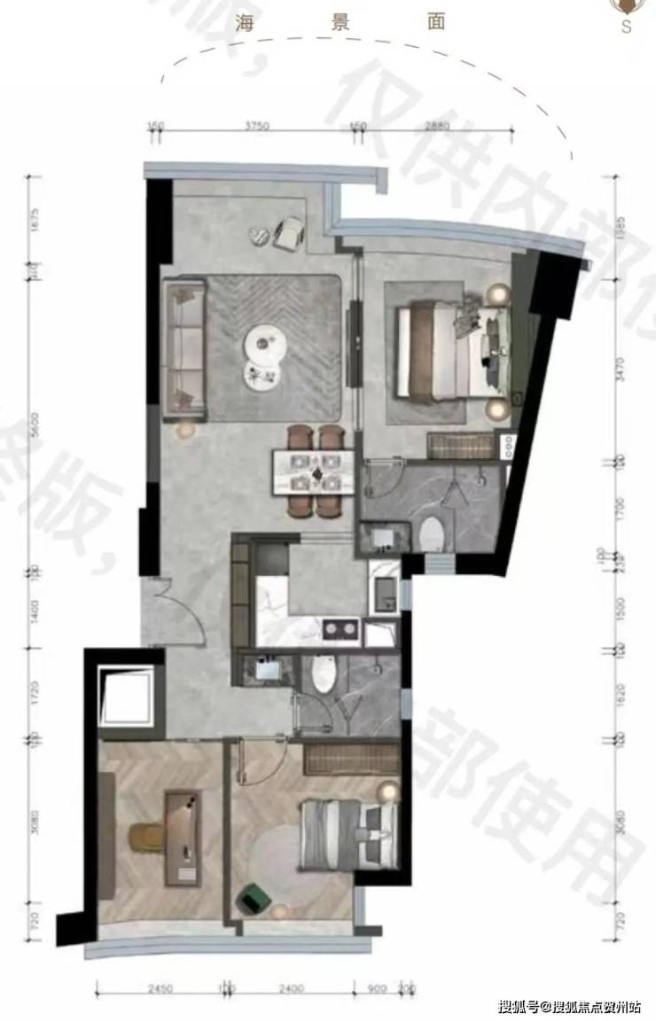 这样的设计让靠近海岸线一侧低,且为扇形布局,避免楼与楼之间的对视,将一线海景资源放入每一户中。
