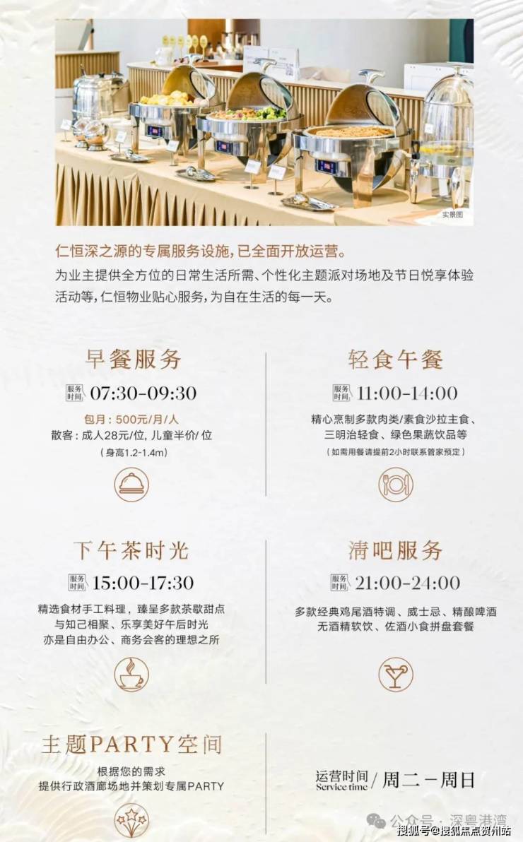 ◎优雅逸境行政酒廊,以“开放式设计+订制化服务”的运营理念,构建“圈层社交+个人私享”的全新体验,提供自助早餐(500元/月)、轻食午餐预定服务,供业主及来宾悠享,全天候多为社交场景+户外露台,可预约包场定制主题派对等专属生活场