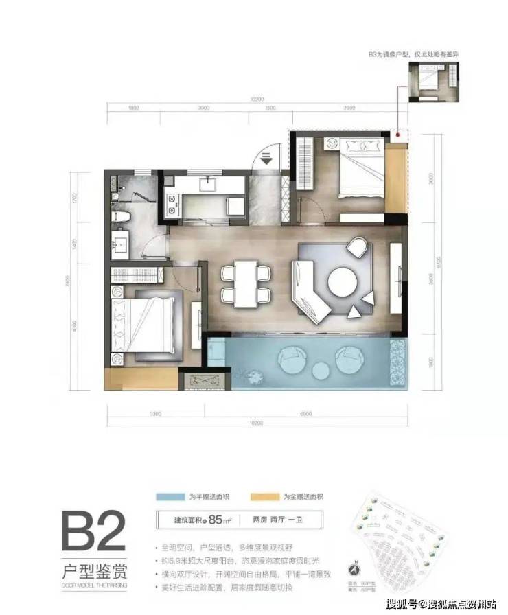 二房横厅户型:全明空间,户型通透,多维度景观视野,约6米超大尺度阳台,恣意浸泡家庭度假时光,横向双厅设计,开阔空间自由格局,平铺一湾景致,美好生活晋阶配置,居家度假随意切换,主卧室南向设计,开间4.4m,带南向凸窗设计,让您的室内空间感更强、更实用,保证充足的采光与通风,并且可奢享园林景观资源。