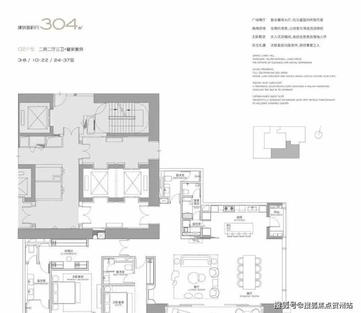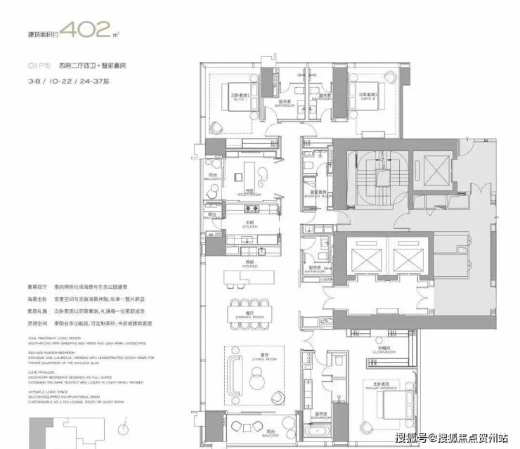 4栋超高层公寓:主力户型300-1000㎡,配备6.8-11米面宽全海景阳台,采用国际顶级豪装标准;