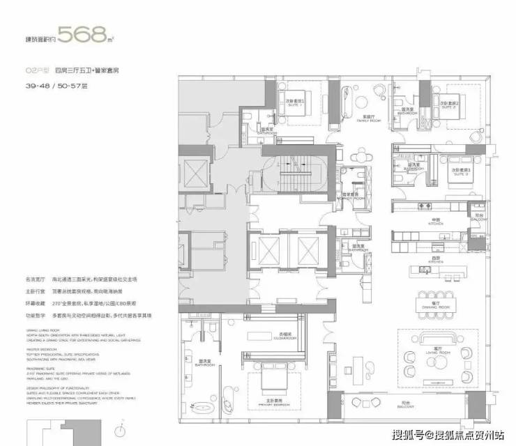 (3-57层)T3栋 四房四卫+家政套间。中西厨分区,餐客西厨一体,带多功能房。端头位置,三面采光。功能完备,房间数充足;实现了主仆双动线;会客观景视野一流。