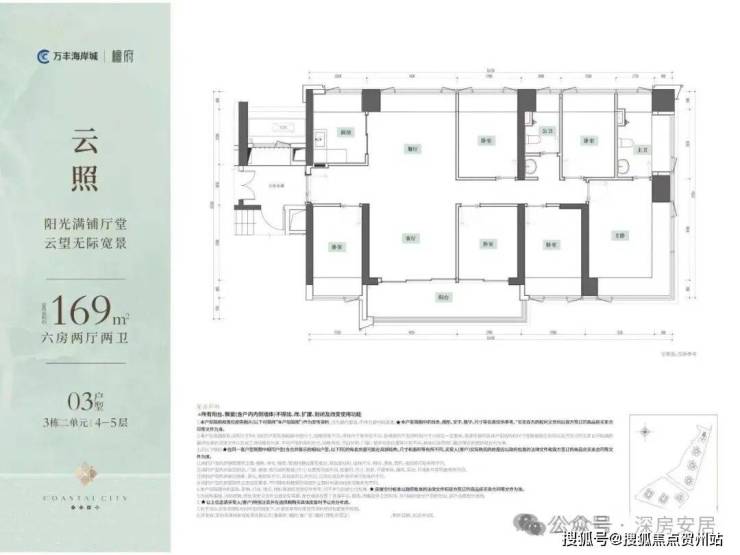169㎡的6房2厅2卫,设计的是竖厅南北通透格局,独门独户,赠送私用公区走道,客厅4.15米开间,餐客厅分离设计,五开间朝南,主卧270°无柱转角飘窗,U型厨房,公卫三段式干湿分离,得房率约99%(包含赠送),7.05米长的超大观景阳台约12.33m²主朝东南向。赠送面积约31.69m²。