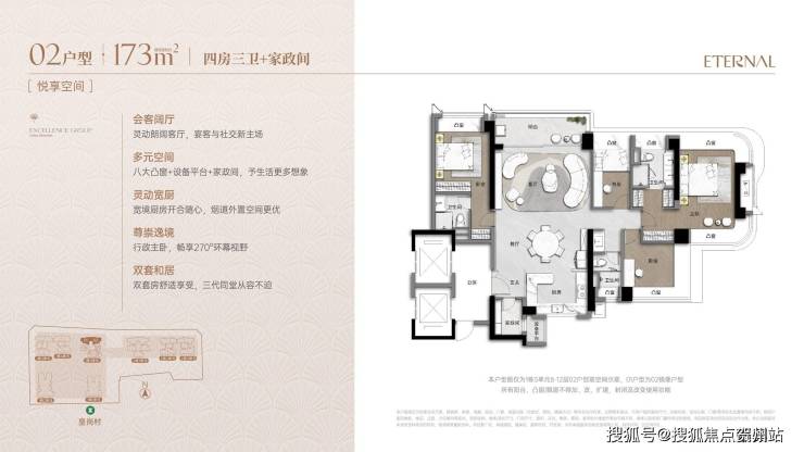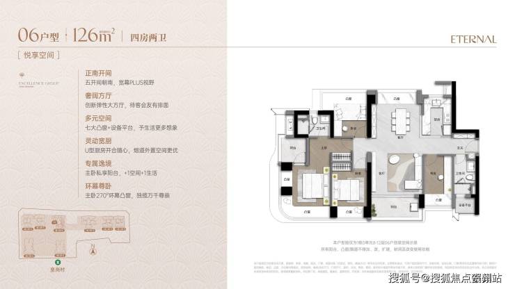 户型采用新规设计,通过弹性方厅、多飘窗等实现90%+使用率