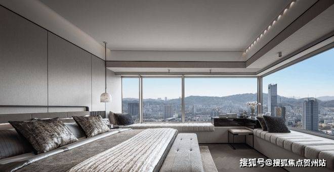 塔楼立面采用竖向线条主边框,营造秩序感与挺拔感,横向线条的飘板, 创造出了独特的水平延伸感,勾勒同频国际的时代审美。采用无山墙设计,以景观资源最大化为导向,所有外墙面能开尽开,实现高窗墙比。塔冠呈现极富生命力的曲线,赋予建筑张力,打造金色塔冠美学。
