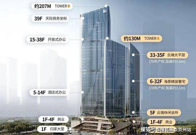 项目产品:楼高 122 米,共 35 层:裙楼商业( 1-4 层);架空层泛会所(5 层)