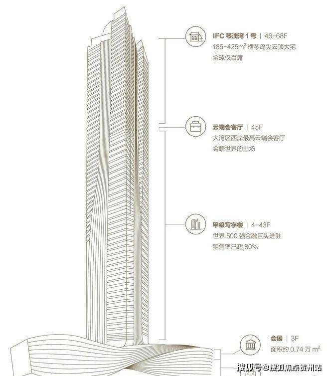 IFC横琴国际金融中心:建筑高度339米,是珠澳第一高楼。华发集团连袂凯达环球Aedas以“乘风驭势,蛟龙出海”为理念,寓意着新生力量磅礴跃起。占地面积约2.3万㎡,总建筑面积约20万㎡,集甲级写字楼、高端住宅、高端商业、会展中心、空中会所等多元高端业态,共69层,其中: