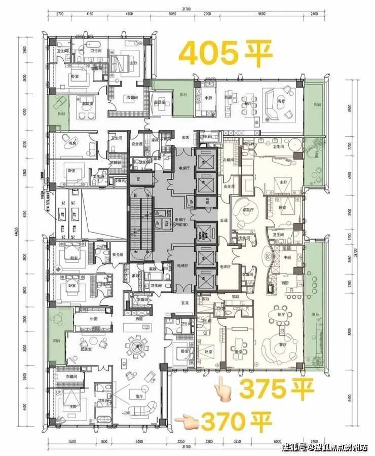 项目首推北区1-2栋共348套房源,户型覆盖209-1100㎡,全部四房三卫起步,彻底告别刚需化设计,保证了圈层的纯粹性。其中,高区58层以上为500-700㎡的顶级大平层,顶楼1100㎡的顶奢大平层仅2套,总价从3000万起,顶楼更是高达4-5亿,单价区间在14-46万/㎡,精准锁定金字塔尖客群。