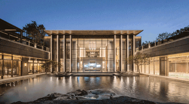 在大师团队的妙笔下,整个项目规划建设 7栋塔楼、8栋板楼、15栋叠墅,高层围绕南面的黑白面将军山和南屏水库形成为围合之势,将面宽1000m的湖景和5000m的山景资源最大化,实现建筑与外部环境的融合协调。