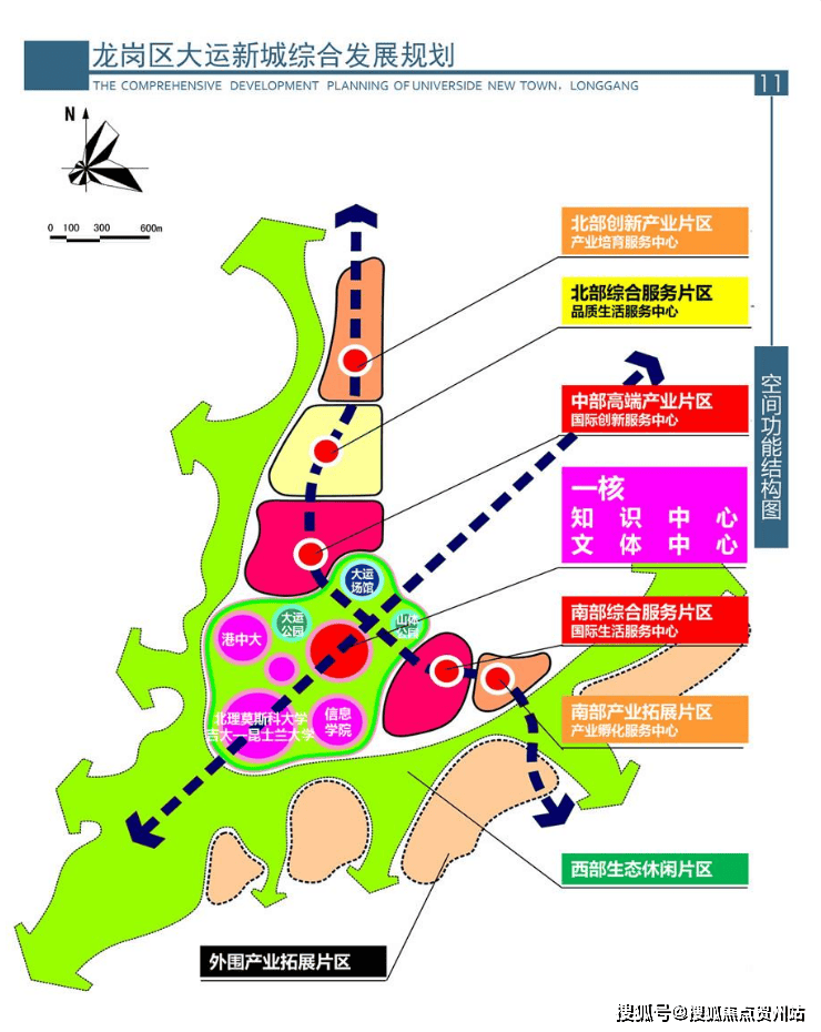 北部创新产业片区:新型产业与科技产业服务区;北部综合服务片区:服务完善的生活配套示范区;中部高端产业片区:高端商务核心与产学研基地,形成智慧产业、现代服务业集聚区;南部综合服务片区:依托轨道站点形成多元复合的综合服务区;南部产业拓展片区:环境优美、成本适中的“龙岗研发孵化公园”;西部生态休闲片区:优质生态本底,与城区有机融合与渗透。