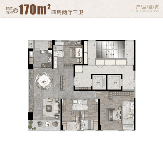 来看建面约170㎡四房三卫,在空间打造上可谓投入百分之百的用心。