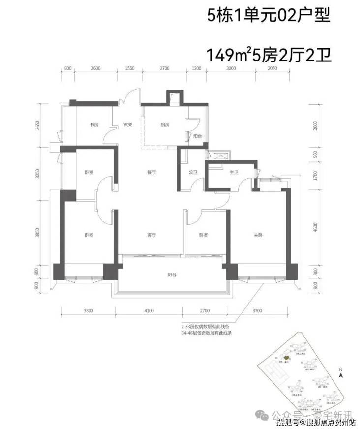 【五栋一单元-平面图】3梯3户,3条腿,分别是01、03号房户型约173㎡的5房2厅2卫、02号房户型约149㎡的5房2厅2卫