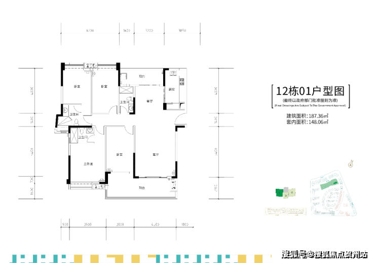 12栋两梯三户,建面约187㎡四房双套间户型。