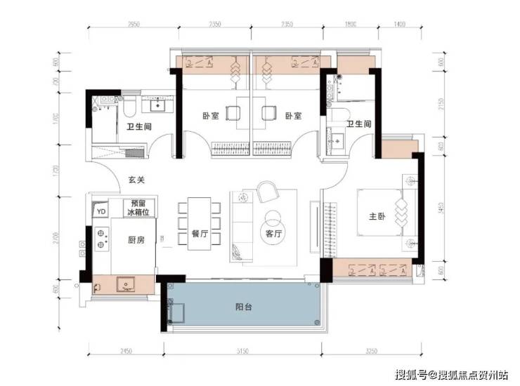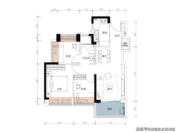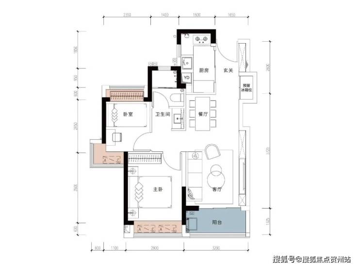 此户型虽为两个卧室,但带有三大飘窗,更加巧妙的是,预留了LDKB一体化设计空间,更好的延伸室内空间,冰箱位置外移,释放厨房空间,小户型也有大空间的享法。