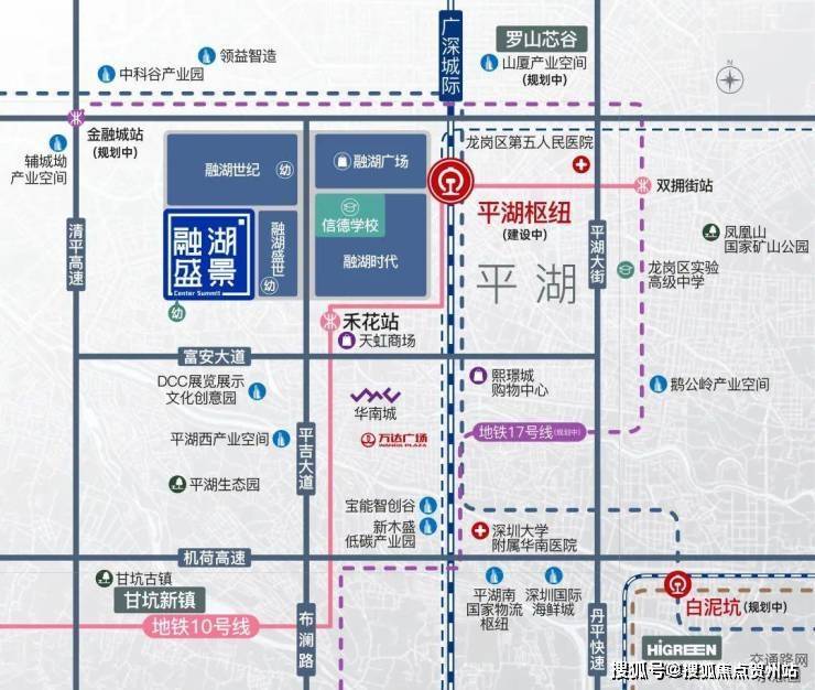 地铁:项目距离10号线禾花站约500米(百度测距),连接坂田,直达福田中心区;另有规划中地铁17号线(直连罗湖口岸)/18号线(连通空港新城),通勤更高效;