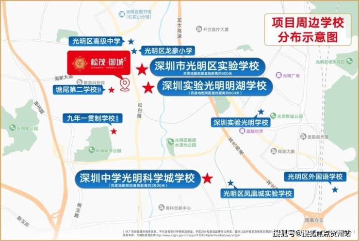 项目自带有1所9班制幼儿园,家门口约100米有1所九年制公办学校在建,另外根据光明区教育局2025年最新的学区划分,松茂御城2期属于塘尾社区,小学学区划分在光明区外国语学校、深圳中学光明科学城学校二部,深圳实验学校明湖校区,凤凰城实验学校、光明区实验学校、玉塘学校、龙豪小学;初中学区划分在光明高级中学、深圳中学光明科学城学校二部、深圳实验学校明湖校区,深圳实验光明学校,深圳大学附属光明学校。