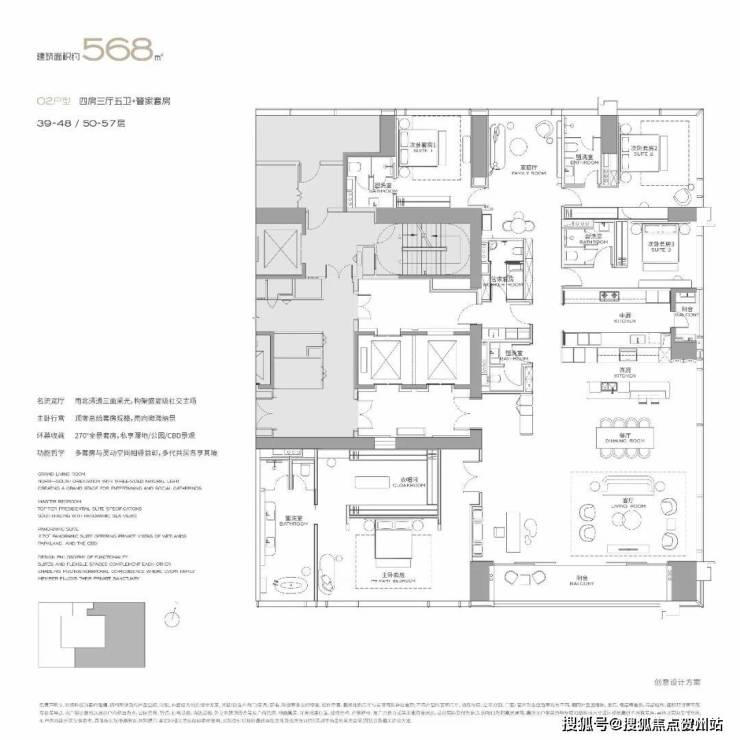 首批推出 303/327/400/570㎡大平层,均通燃气且配备超大阳台,部分户型采用 270° 环幕视野设计。
