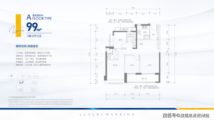 99㎡三房:东南朝向单价6.4万-7.4万元/平方米(总价630万-730万元),西南朝向单价6.1万-7.1万元/平方米(总价600万-700万元)