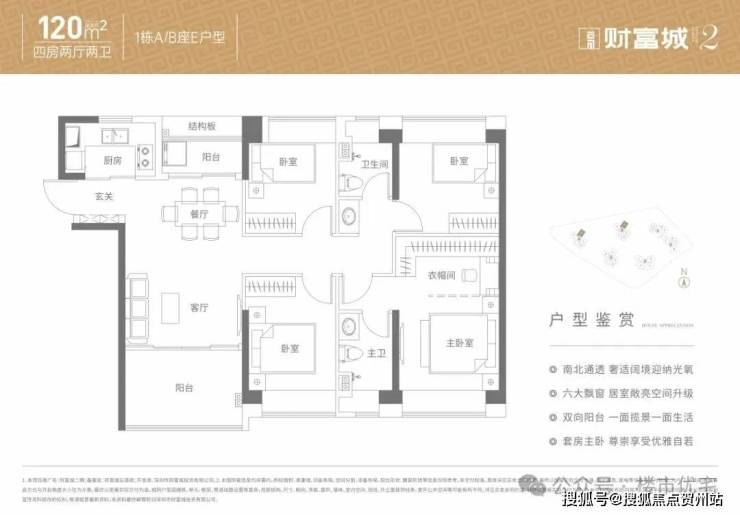 120㎡的4房2厅2卫,设计的是竖厅南北通透格局,双阳台设计,客厅3.6米开间,4个卧室分别是3.2/3.2/2.75/2.75米的宽度,U型厨房,得房率约:74.92%(不含赠送),阳台主朝东南、西北、东北向。