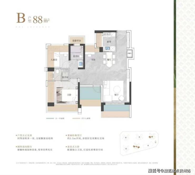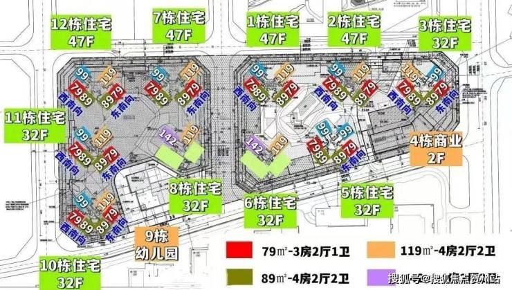 实际使用率(含赠送)在95%左右,相比建筑老规设计,得房率高了10%。79㎡就能做到三房二卫,89㎡能做到四房二卫,99-119㎡四房二卫。