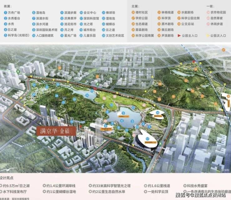 满京华·金硕悦府与科学公园仅一街之隔,尽享得天独厚的生态优势。公园北起公常路,南至光辉大道,西临楼环路,东接光明大道与光侨路,地理位置优越。马鞍山、柴山及两山之间的天然山坳,与楼村水、新陂头河两条水系交织,构筑起独一无二的自然基底。园内科学芯、日之湖、环湖岸线、林霄栈道等特色景观错落分布,每一处都彰显着自然与科技的完美融合。
