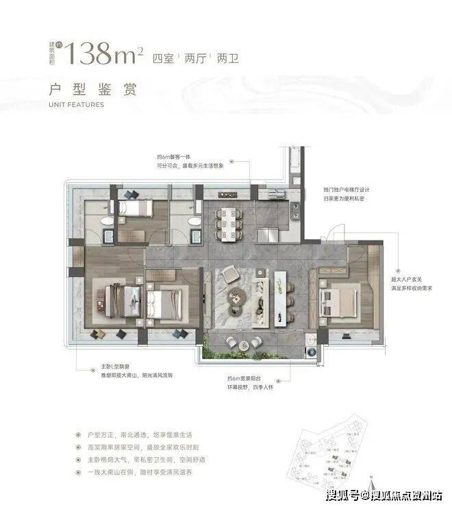 竖庭格局,西南向,基本居住功能与建面约108-110㎡4房2卫一致,但格局不一样,主卧空间有了更大的提升。
