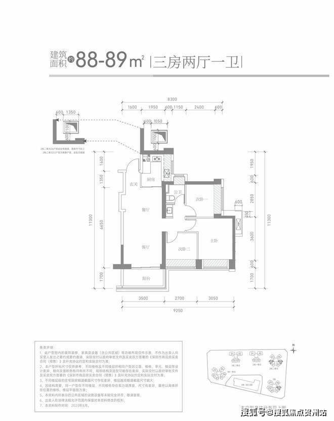 89㎡-89㎡的3房2厅1卫:3房2厅1卫,传统的竖厅动静分区格局;客厅进深8米(不含阳台),开间3.5米,主卧接近12㎡(不含主卫和飘窗);项目两次卧的飘窗均可以打掉,优化飘窗后两次卧的面积在9平米;整个户型的设计有点割裂,89平米的建筑面积,客厅开间可以做到3.5米,主卧以及两次卧(飘窗打掉后)的面积都比较开阔 这种89平米只有一个卫生间的新房,在光明市场可以说是没有竞争力的,所以这种户型只有少量,也不是项目的主力户型,不过从单价来说,这种户型是最优性价比的。