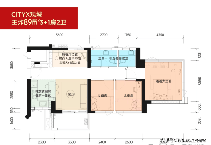 建筑面积约89㎡的3+1房2卫的01/07户型:全能型成长空间典范