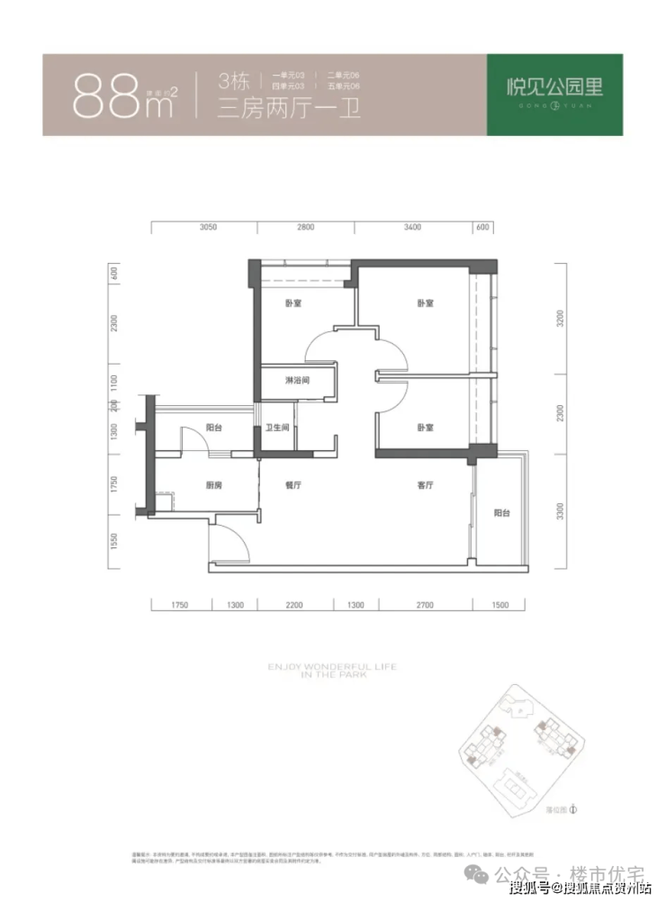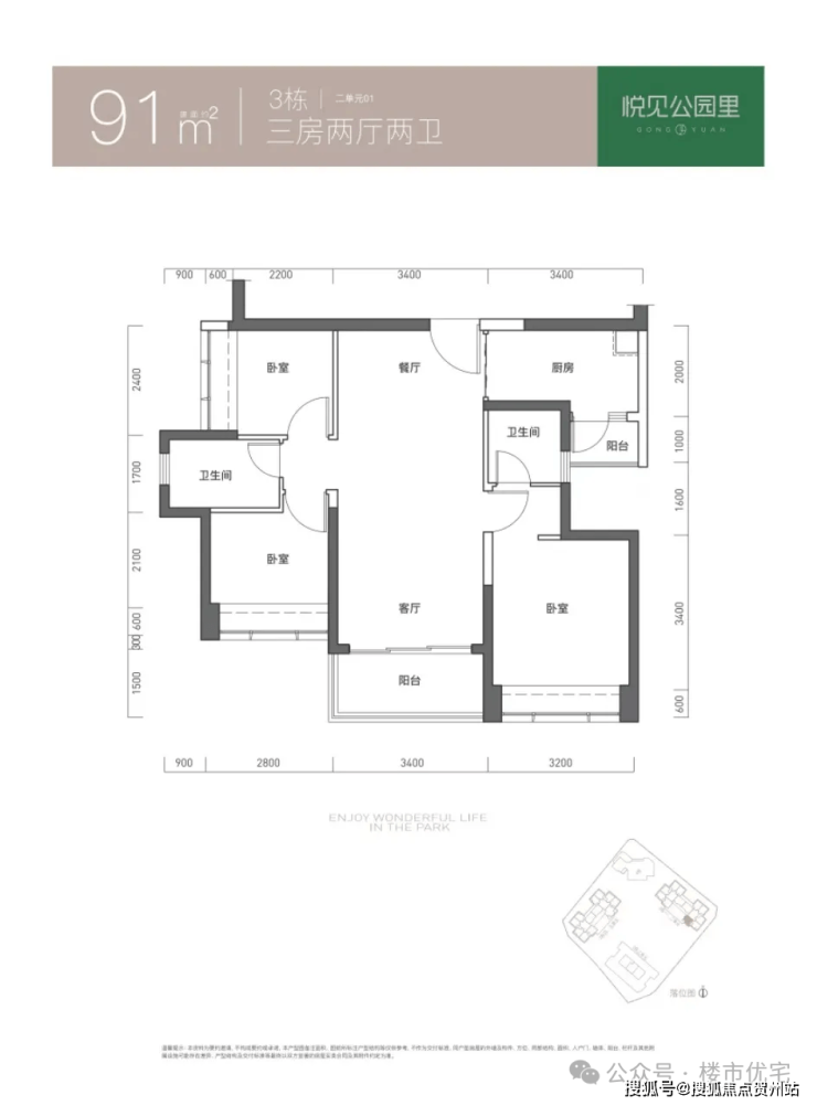 91㎡的3房2厅2卫,仅3栋2单元01户型,设计的是竖厅双龙抱珠格局,客厅3.4米开间,三开间朝南,3个卧室分别做到了主卧11.9㎡/次卧7.06㎡/次卧6.2㎡(实测面积,去掉墙体),L型厨房带1个生活阳台,卫生间干湿分离,得房率73.55%(不含赠送),西南朝向。